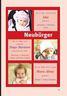 Am 4. Sept. 2016 wurde Ida geboren. Annika & Thomas Stein Neubürger Am 20. März 2017 erblickte Tiago Mariano das Licht der Welt. Thomas & Melanie Patas Ferreira Pieper Am 22. März 2017 wurde Mara Alina geboren. Heike & Simon Kieber 55